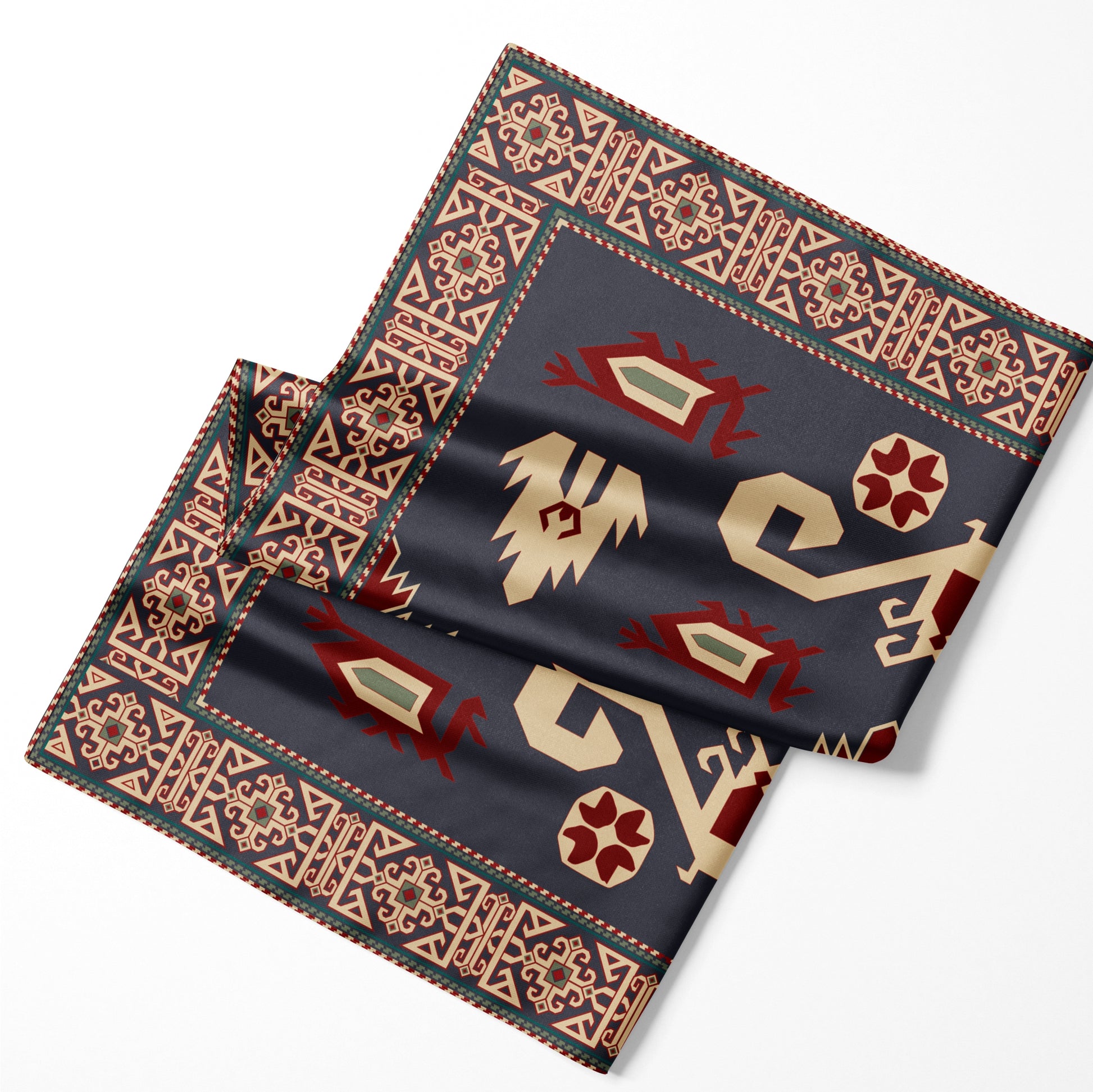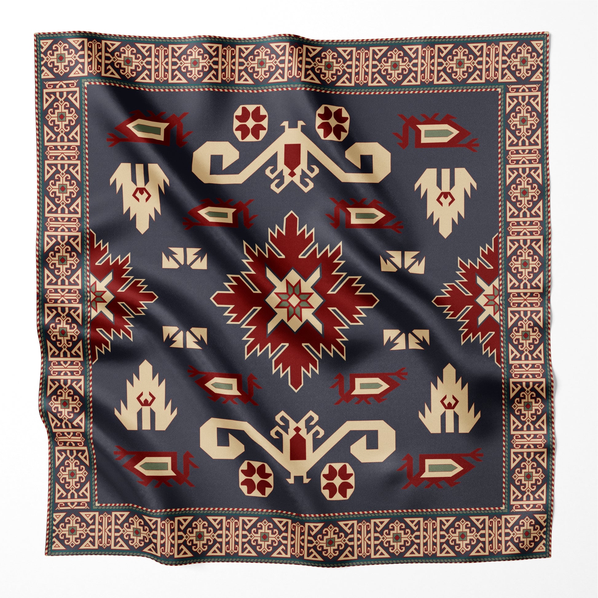 Luxurious silk scarf featuring traditional Pirebedil patterns in navy blue, burgundy, and beige. Exquisite geometric design with central medallion and ornate border motifs. Premium quality silk with hand-rolled edges. Size: 90cm x 90cm (35.4 x 35.4 inches).