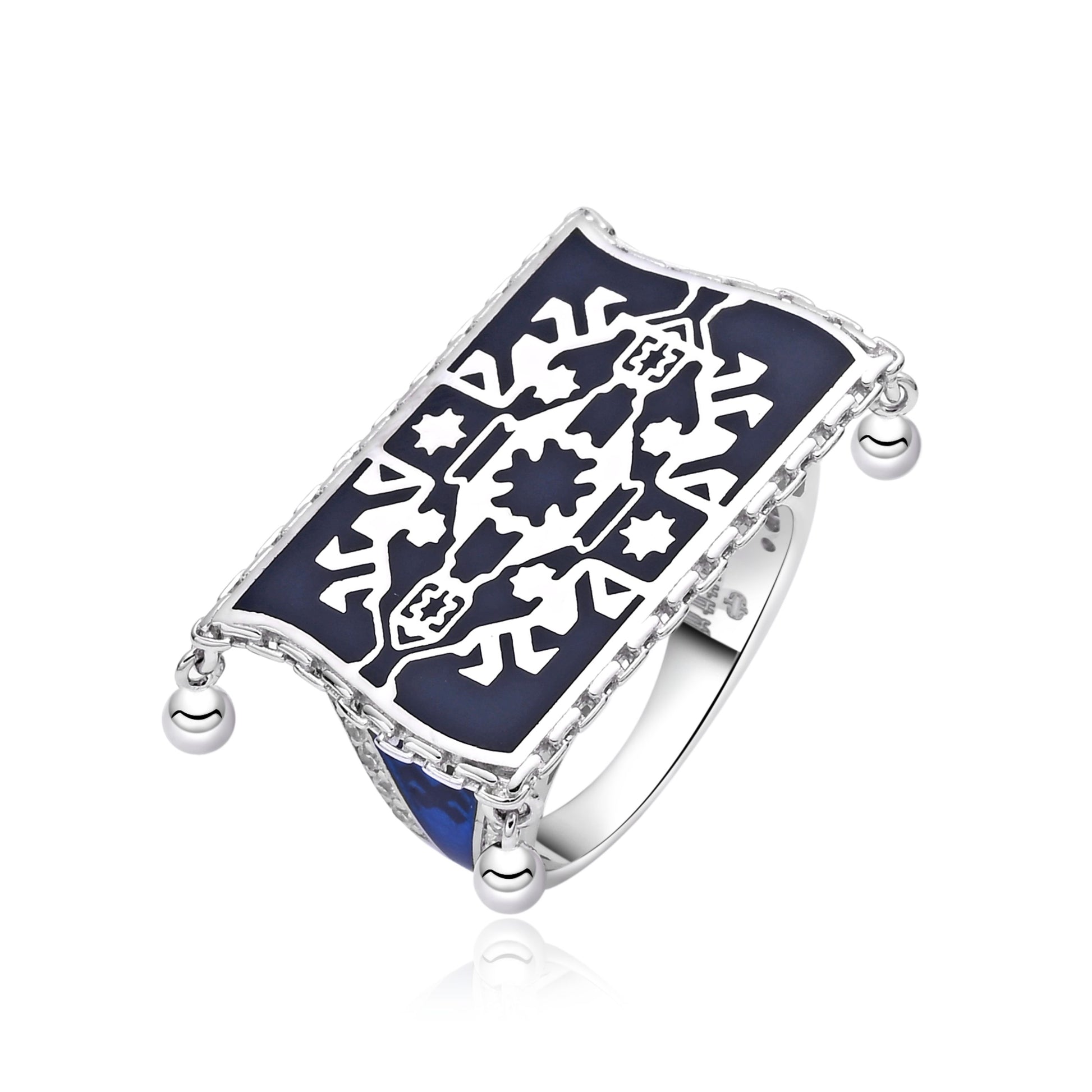 Luxurious statement ring featuring intricate carpet patterns with sacred geometry on deep blue enamel. This rectangular design showcases traditional ornamental motifs with decorative corner details, embodying the timeless beauty of nomadic textile art.